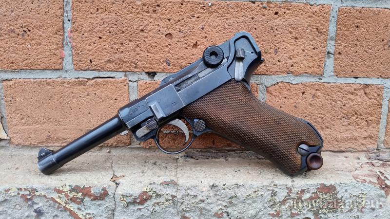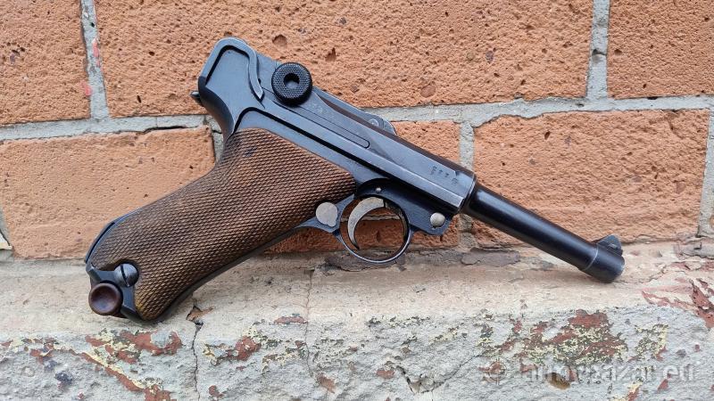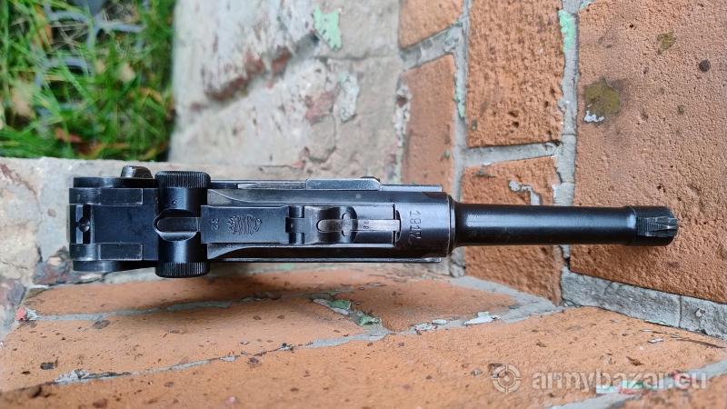Opis: Produkcja fabryki DWM ze schyłku I wojny światowej. Broń posiada wszystkie odbiory wojskowe. Broń w pełni zgodna numerycznie (oprócz magazynka który jest nienumerowany). Magazynek ze stopką drewnianą czyli właściwy dla I wojny światowej. Pistolet używany, strzelany. Oksyda prawdopodobnie oryginalna, ale miejscami poprawiana. Stan wizualny taki jak widać na fotkach - super Lufa w stanie dobrym dobrym - gwint wyraźny, ale matowy z kaszą. Okładziny także oryginalne. Technicznie wszystko ok. Piękna ozdoba każdej kolekcji! tel. 882 489 978 www.arsenalsilesia.pl DOWOZY BRONI sklep@arsenalsilesia.pl