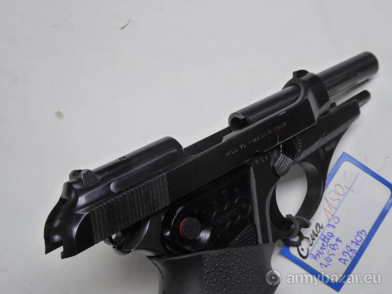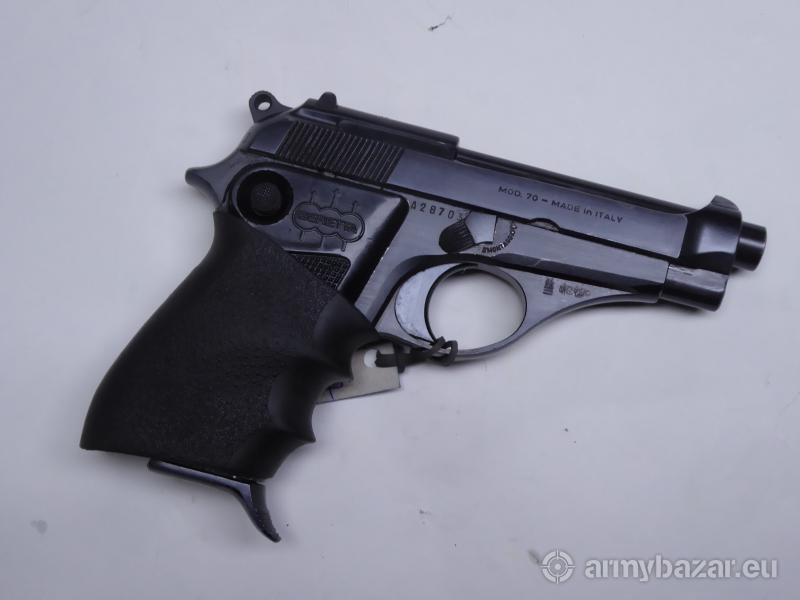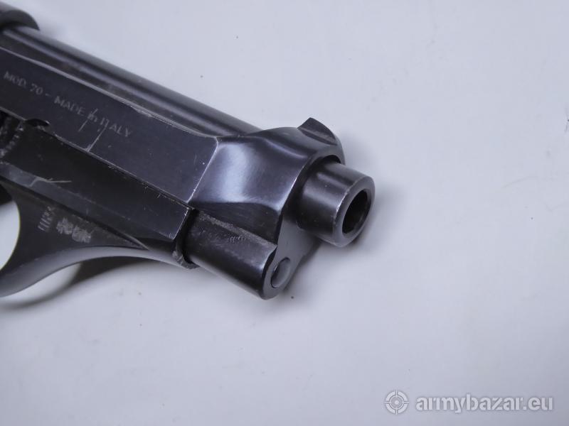 Opis: Stan bardzo dobry, lufa super A28703 Beretta 70 była bronią samopowtarzalną, działającą na zasadzie odrzutu zamka swobodnego. Mechanizm spustowo-uderzeniowy kurkowy, pojedynczego działania. Pistolet wyposażony był w bezpiecznik nastawny którego skrzydełko znajdowało się z lewej strony szkieletu i zatrzask zamka. Pistolet był zasilany z jednorzędowego magazynka pudełkowego. Długość 160 mm Długość lufy 85 mm Masa broni 660 g