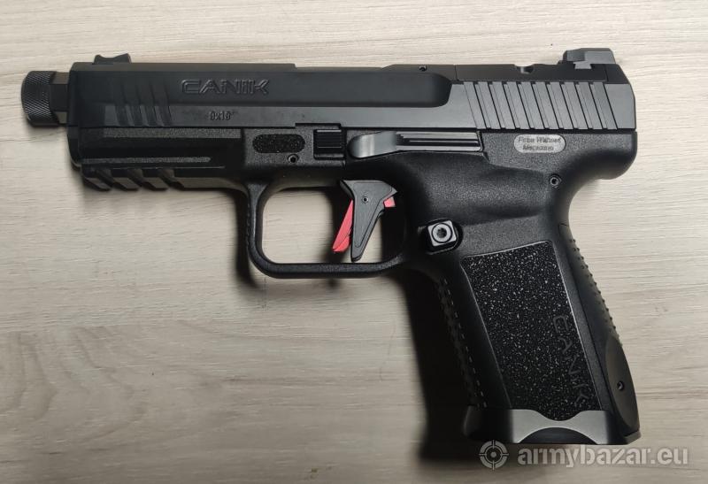 Opis: Pistolet Canik TP9 Elite Combat w kalibrze 9×19 mm Para. Konstrukcja z mechanizmem spustowym typu SAO, przeznaczona do strzelania półautomatycznego. Model o długości 200 mm i długości lufy 120 mm, masie 803 g oraz szerokości 38 mm. Standardowa pojemność magazynka wynosi 15 lub 18 nabojów. Opór spustu w trybie SA wynosi około 28 N. W zestawie znajduje się pistolet, polimerowa kabura, dwa magazynki o pojemności 15 nabojów, cztery montaże pod kolimator, szybkoładowarka, wymienne panele tylne chwytu, wymienne nakładki zwalniacza magazynka oraz zestaw do czyszczenia. Egzemplarz mało używany, w bardzo dobrym stanie technicznym i wizualnym.