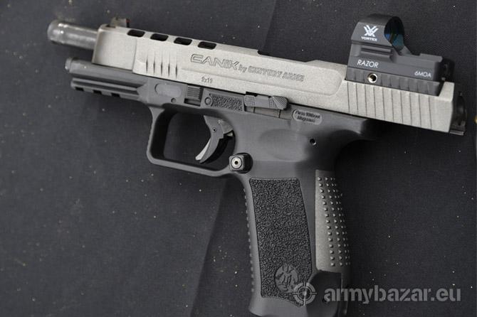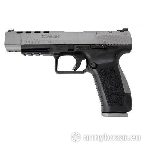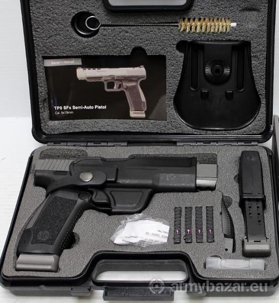 Opis: Pistolet Canik TP9 SFx kal. 9mm Luger, wyprodukowany w tureckich zakładach zbrojeniowych. Nowość na rynku europejskim. Stał się bardzo popularnym pistoletem w Stanach Zjednoczonych i cieszy się bardzo dobrą opinią przez tamtejszych strzelców. Posiada bardzo bogate wyposażenie, firma Canik oferuje w komplecie z bronią, szybką kaburę obrotową z ABS, zestaw do czyszczenia, dwa magazynki, cztery bazy montażowe różnych rozmiarów pod celownik kolimatorowy, szybkoładowacz magazynka, wymienną okładzinę rękojeści, przełącznik zrzutu magazynka dla lewo i prawo ręcznych, dwa zapasowe światłowody muszki, regulowane przyrządy celownicze.