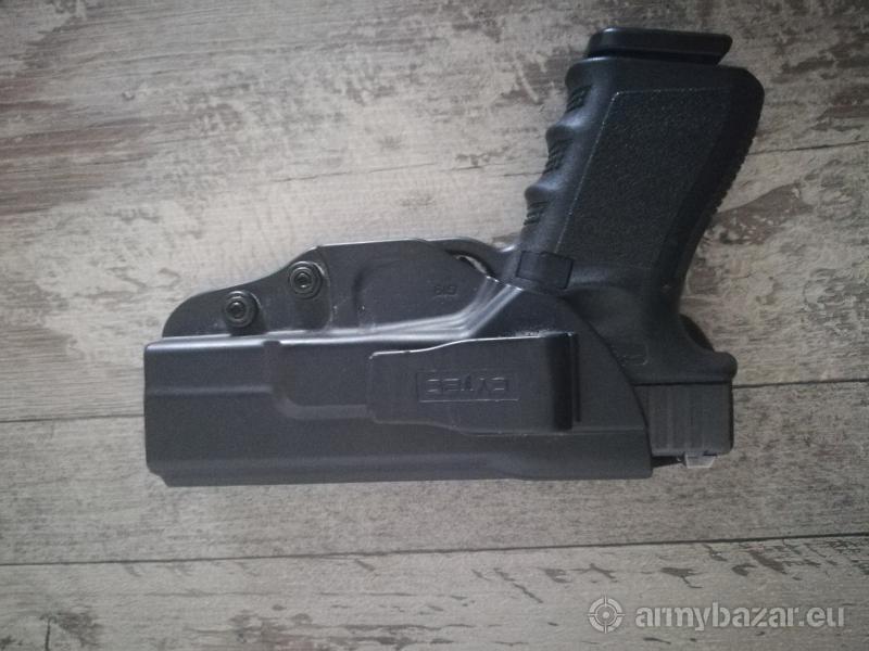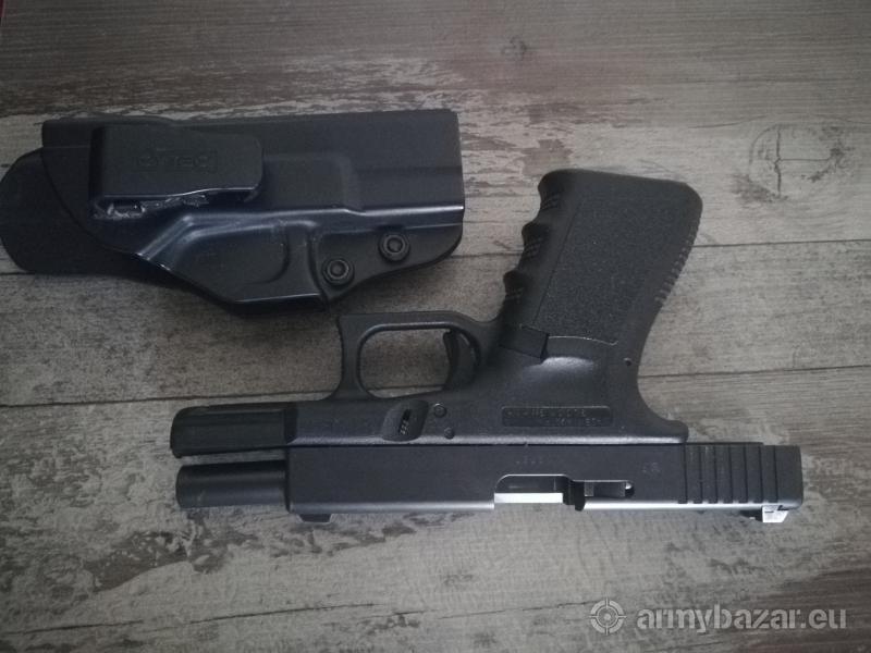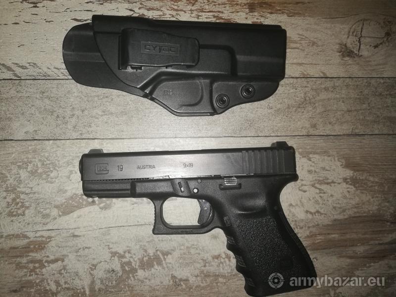 Opis: Pistolet Glock 19 stara dobra gen.3 w kal. 9mm. Broń głównie noszona i z tego wynikają jedyne ślady użytkowania. W zestawie z kaburą wewnętrzną CYTAC oraz dwoma magazynkami. Przyrządy zostały wymienione na markowe, metalowe. Spust po wymianie i tuningu. Dorzucam też amunicję na start.