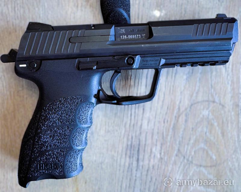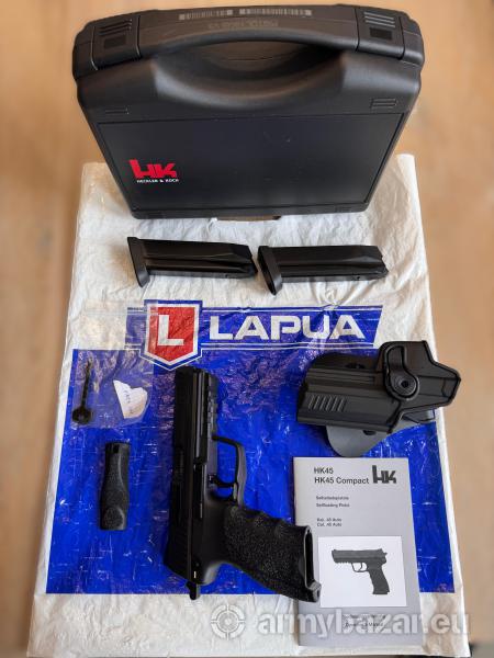 Opis: Pistolet kupuiony w salonie LAPUA w Warszawie, przebieg 68szt!!!!!!!!!!!!!!!!!!!!!!!!!!!!!!!! Stan idealny , sprzedaję wszystko to co na zdjęciu nr 1 poniżej specyfikacji tego modelu zapraszam do kontaktu 533-309-921 Specyfikacja - HK 45: - kaliber: .45 ACP - pojemność magazynka: 10 sztuk - przyrządy celownicze: stalowe, układ trzech kropek - długość: 204 mm - szerokość: 39 mm - wysokość: 144 mm - długość lufy: 113 mm - długość linii celowania: 168 mm - waga broni: 880 g (bez magazynka) / 990 g (z pustym magazynkiem) - wersje kolorystyczne: czarna Typ broni krótkiej: Pistolet Optics Ready: Nie Mechanizm spustowy: kurkowy SA/DA Szkielet: Polimer