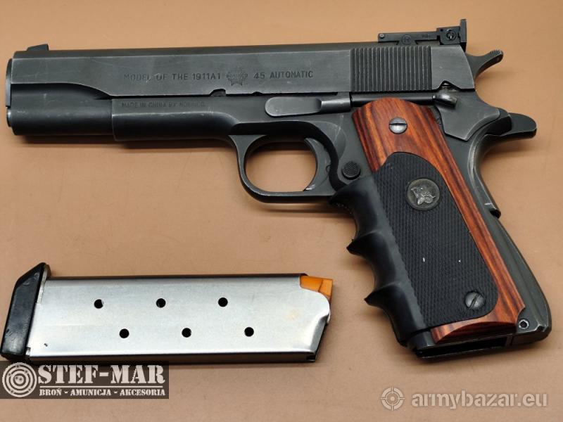Opis: DARMOWA DOSTAWA PRZEZ CAŁĄ POLSKĘ. Broń używana, sprawna w 100%. Bardzo niezawona kopia Colta 1911.Ceniona przez strzelców i rusznikarzy za lepszą gatunkowo stal niż w oryginale,baza do tuningu.Posiada magazynek na 7 naboi .45ACP i ulepszone,regulowane przyrządy celownicze.Ślady użytkowania na szkielecie broni Broń po przeglądzie rusznikarskim, przestrzeliwana na strzelnicy. - dł całk: 220mm - dł lufy: 128mm - waga: 1134g Do broni dołączam fakturę VAT. W razie pytań proszę dzwonić właściciel 501 682 999, biuro 516 904 226 Możliwość dostarczenia broni we wcześniej uzgodnione miejsce w kraju. BROŃ PALNA! Wymagane jest pozwolenie na broń. Nr broni: 612345 Nr kat: C4786