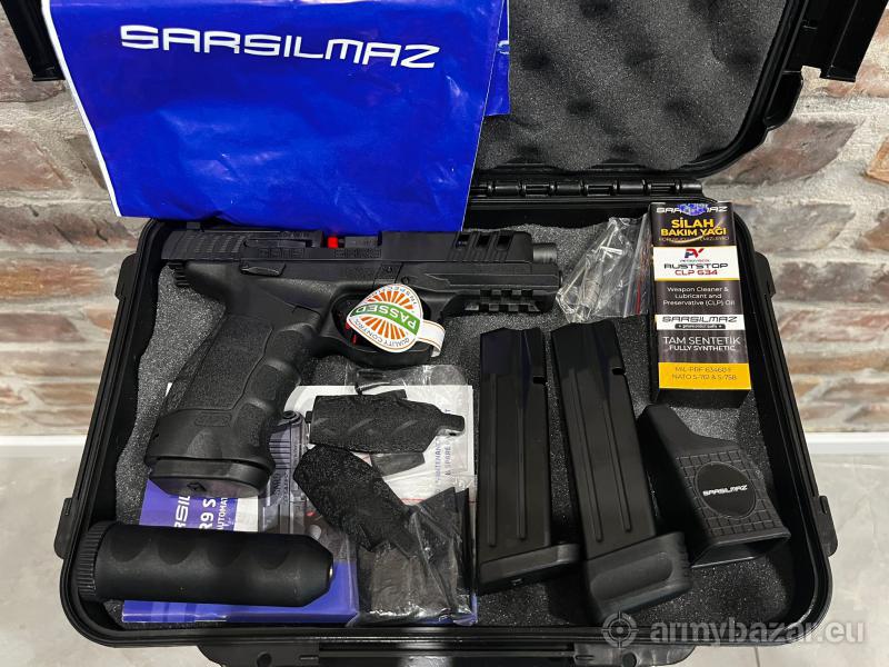 Opis: Pistolet Sarsilmaz SAR9 Black Gen 3 kal. 9×19. Pistolet wyposażony w bezpiecznik zamka oraz spustu. Chwyt z wymiennymi okładkami (z tyłu i po bokach) pozwala w pełni dostosować go do dłoni strzelca. SAR9 Gen 3 jest standardowo wyposażony w klasyczne celowniki trójpunktowe i szynę Picatinny do montażu dowolnego oświetlenia. Możliwość montażu kolimatora. W zestawie: walizka, 2x magazynki 17nb + 18nb, szybkoładowacz, olej, wycior. Broń nowa. Produkt koncesjonowany, dostępny za okazaniem odpowiednich dokumentów. Tel. kontakt 737 396 130 lub przez guns-ammo.pl