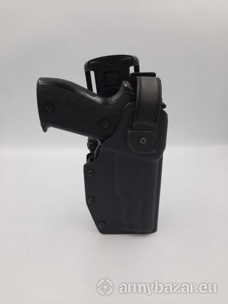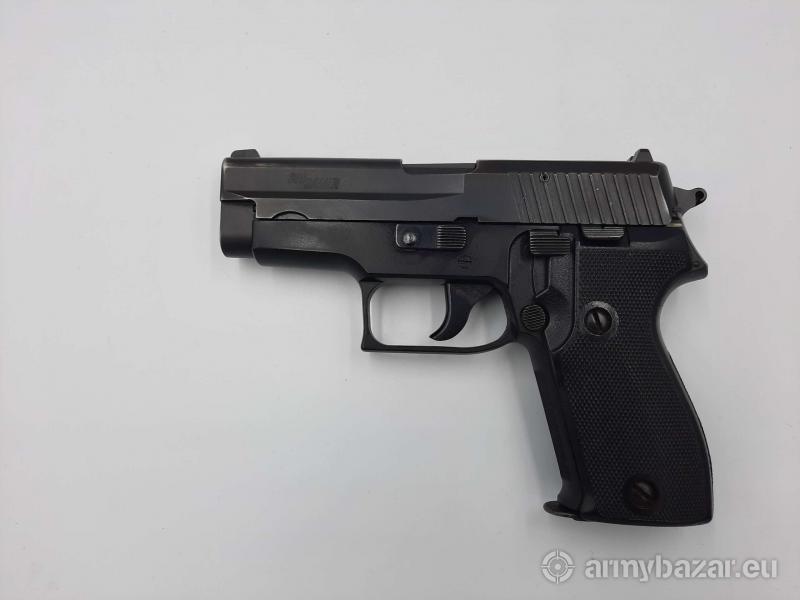 Opis: Pistolet SIG SAUER P225 produkcji zachodnioniemieckiej. Kal. 9×19 mm Para. Stan bardzo dobry, przewód lufy w stanie idealnym. Rok produkcji 1989. W komplecie 2 magazynki i kabura. Dane techniczne: Kaliber 9×19 Magazynek 8 naboi Wymiary: Długość 180 mm Wysokość 131 mm Długość lufy 99 mm Długość linii celowniczej 145 mm Masa broni820 g (niezaładowanej)