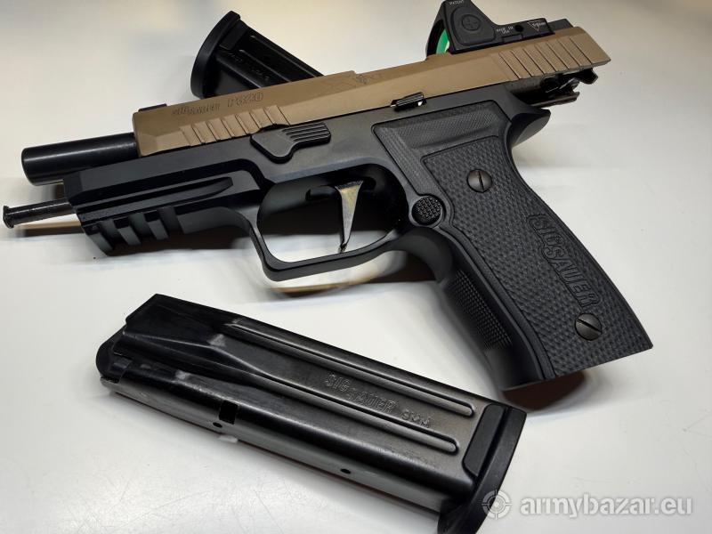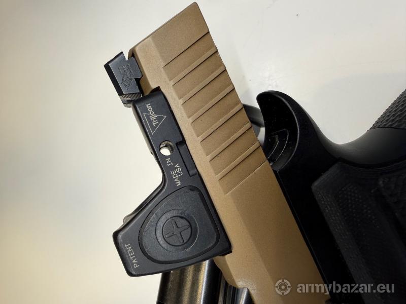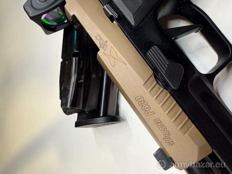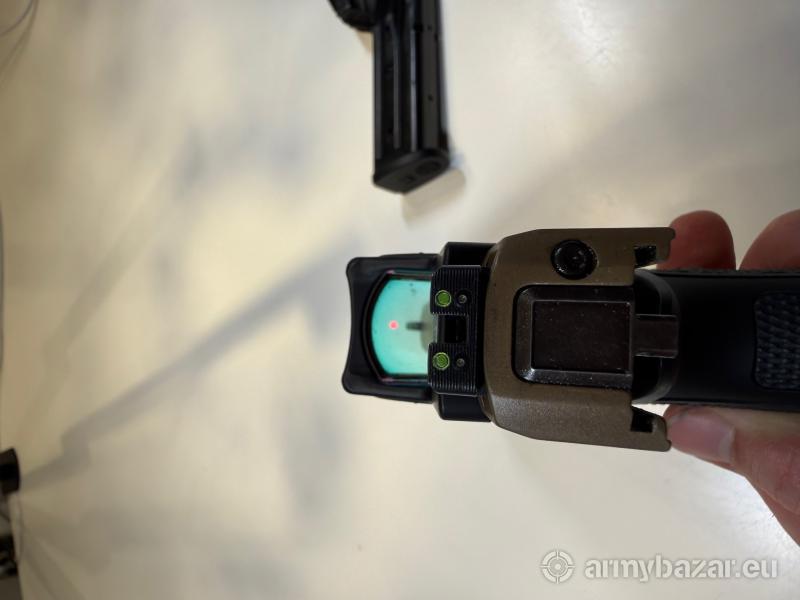 Opis: Pistolet Sig sauer limitowanej wersji Vtac, dodatkowo 3 metalowe magazynki, dodatkowo w zestawie kolimator trijicon, zielone trytowe przyrządy celownicze, pistolet sporadycznie używany, jak nowy