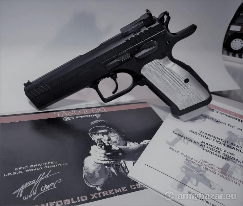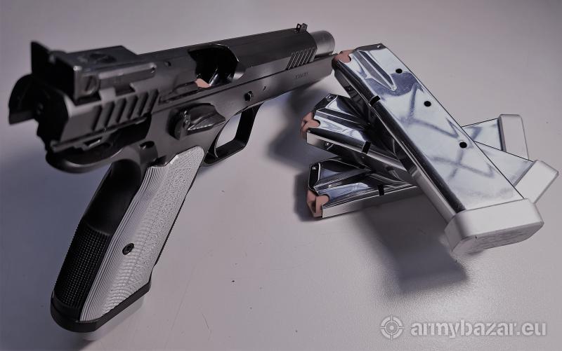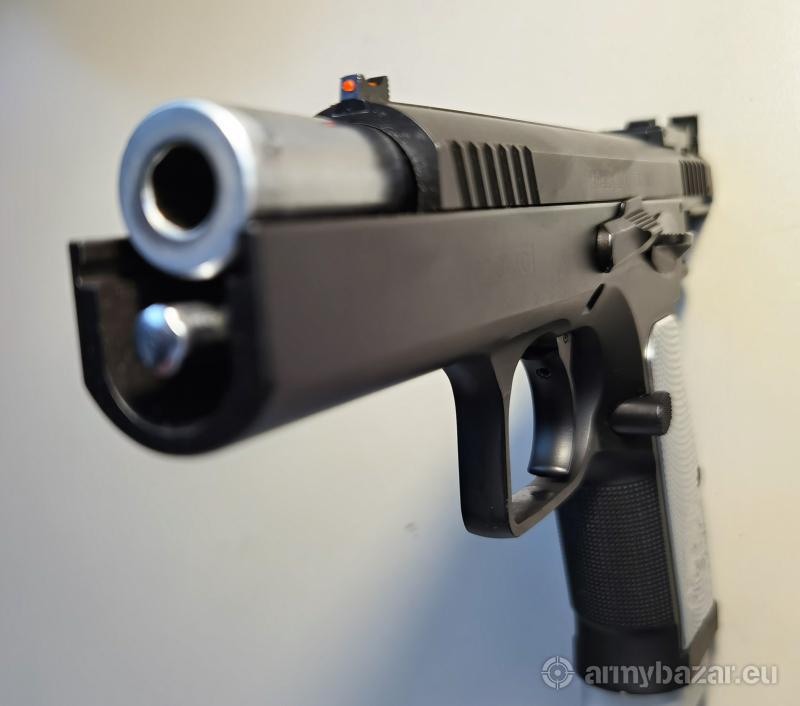Opis: W zestawie; - walizka, - cztery oryginalne magazynki INOX 17-nabojowe, - zestaw do czyszczenia i konserwacji broni z wyciorami, - dokumentacja, Pistolet kupiony nowy w czerwcu 2018 roku. Przebieg około 5.000 strzałów. Strzelany jedynie z amunicji fabrycznej Sellier&Bellot oraz Magtech. Gruba poligonalna lufa. Powiększony zwalniacz magazynka. Regulowana szczerbina. Dodatkowa muszka światłowodowa. Aluminiowe okładziny. Model używany przez światową czołówkę strzelców dynamicznych.W tym 5-krotnego Mistrza Świata IPSC – Erica Grauffel’a Broń zadbana, w bardzo dobrym stanie technicznym i wizualnym