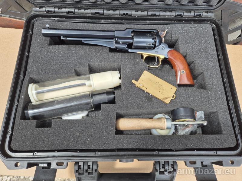 Opis: Rewolwer Remington 1858 firmy Pietta. Pełen zestaw ze zdjęcia: -Rewolwer Remington -Walizka -Ładownica do kaszki -Ładownica do prochu -Kapiszonownik -Smar -Kule -Kapiszony -Prasa Mało strzelany, ponieważ mam pozwolenie na broń i z czarnoprochowca strzelam raz do roku.