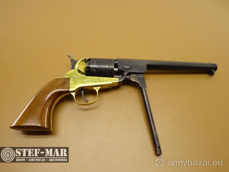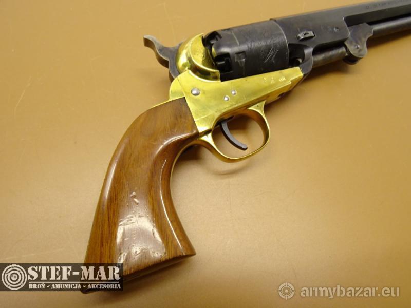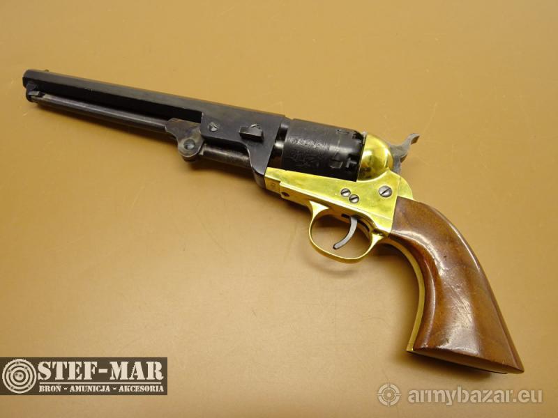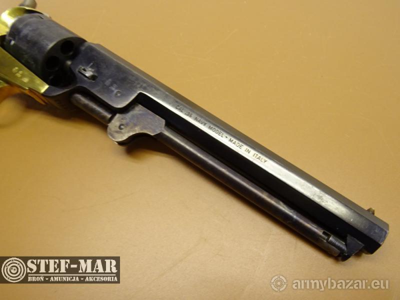 Opis: Rewolwer czarnoprochowy Navy kaliber .36 Broń używana, sprawna w 100%. Stan broni bardzo dobry. Posiada złocenia na ramie, oraz zdobienia na bębenku. Chwyt drewniany w bardzo dobrym stanie, bez uszkodzeń. Dostępna prezentowana sztuka, stan widoczny na szczegółowych zdjęciach. Oś-ok , Luz-0,10 Stan lufy jest bardzo dobry Broń po przeglądzie rusznikarskim. Dane techniczne broni: - kaliber: .36 - rok produkcji: 1970r. - długość całkowita: 330mm - długość lufy: 190mm (7") - waga: 1148g Do broni dołączam fakturę VAT marży. W razie pytań proszę dzwonić właściciel 501 682 999, biuro 516 904 226