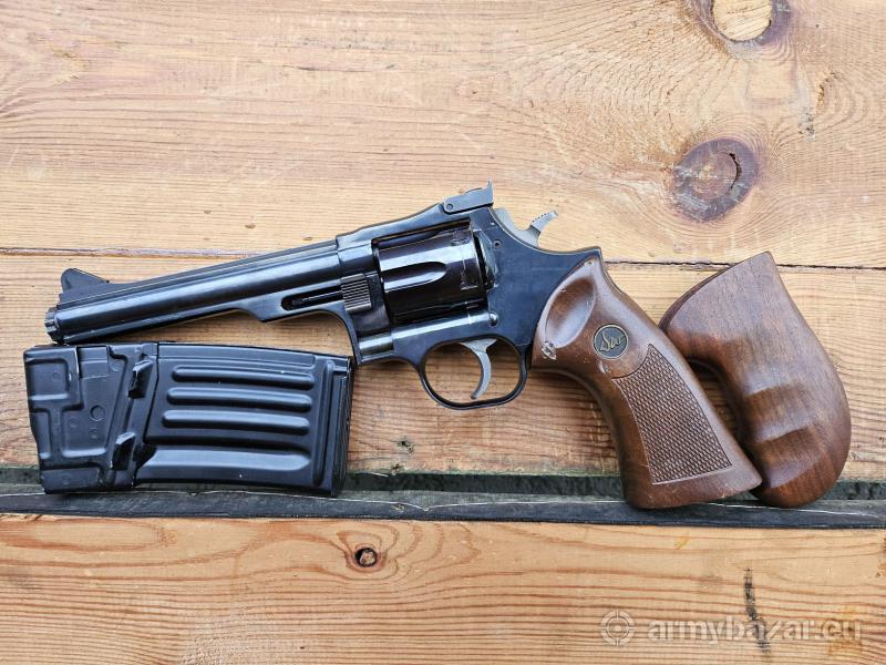 Opis: Rewolwer Dan Wesson M12 kal.. 357 Magnum. Produkcja Monson, MASS, USA w latach 1968-1970. Jeden z pierwszych modeli produkowanych przez Dan Wesson. Bębenek 6-nabojowy, system SA / DA. Przewód lufy – lustro – długość 6″ – 15,24 cm. W komplecie dwa oryginalne chwyty: standardowy i anatomiczny. Przyrządy celownicze: muszka i szczerbinka – regulowane. Więcej zdjęć na stronie www.mkbarmory.pl Masz pytania: tel. +48 786 953 929 Na zakup wymagana jest promesa. Możliwa dostawa zakupionej broni.