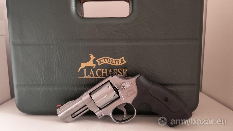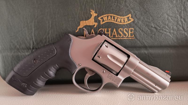 Opis: Piękny rewolwer Walther R99 kaliber .357 Magnum / .38 Specjal. Lufa 3 całe. Tożsamy z modelem S&W 66-5. Komplet kolekcjonerski wraz z walizka Negrin z zielonej skóry instrukcja i nożem Walther. Nakładki na rękojeść.