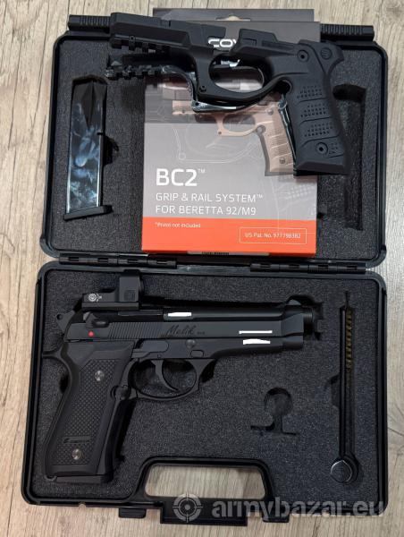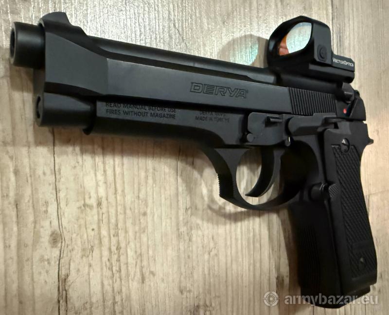 Opis: Derya Melik 9mm, turecka kopia Beretty 92 FS. Zakupiony w marcu 2025. Przelot okolo 250 sztuk, ledwie dotarty. Perfekcyjna i bardzo celna kopia Beretty 92 FS. 2 magazynki 17to nabojowe. Szczerbinka wymieniona na plytke pod kolimator, zamontowany Vector Optics Frenzy (oczywiscie szczerbinka oryginalna jest w komplecie). Dodatkowo system Recover BC2 - okladziny + szyny do latarki/lasera.