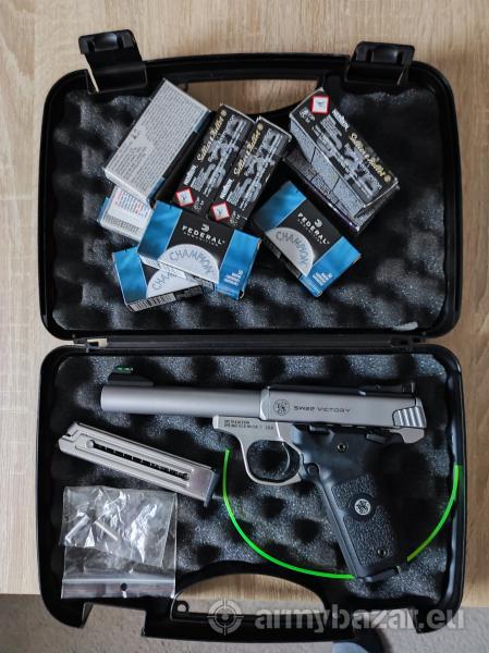Opis: S&M Victory 22Lr w bardzo dobrym stanie,wystrzelane 6-7 paczek amo.Cena za cały komplet jak na foto.