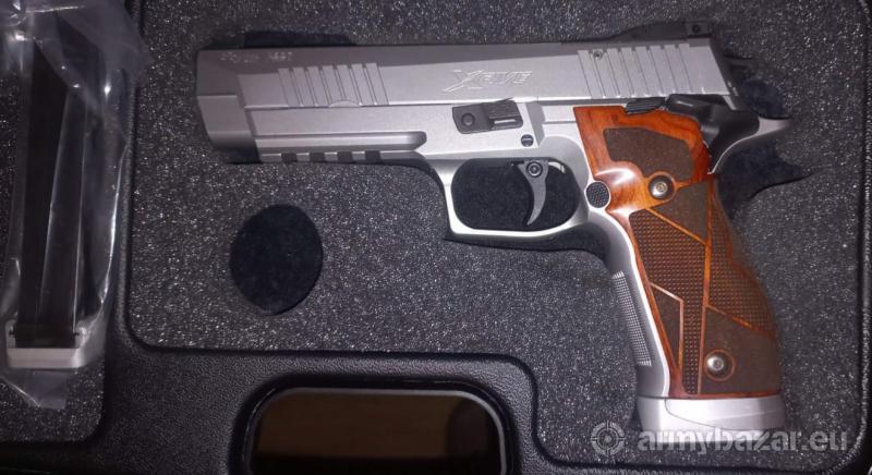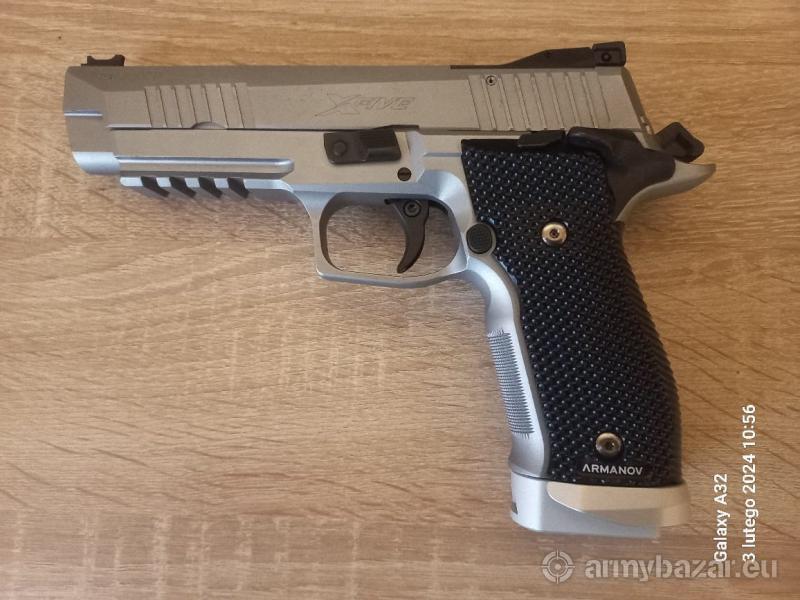 Opis: Sig Sauer P-226 X-five - stan ideał, przebieg kilkadziesiąt sztuk (dwa magazynki jeszcze w folii). Pistolet przystosowany do kolimatora. W pełni regulowany imbusem spust i reset. Ponieważ pistolet został nabyty "do mania" dokupiłem do niego czarne okładziny Armonova - fabryczne okładziny są wykonane ze szlachetnego drewna (machoń).