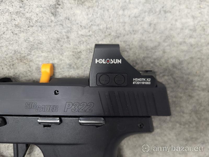Opis: SIG SAUER P322 kal. 22LR z kolimatorem HOLOSUN 407K + 3 magazynki. Przebieg około 1800 szt. Broń zakupiona w tym roku.
