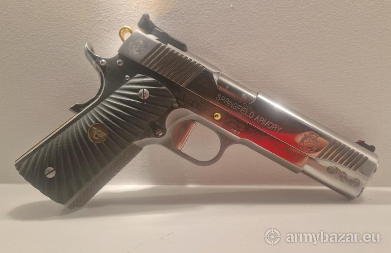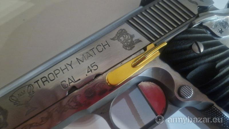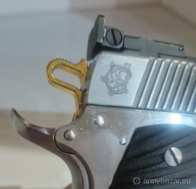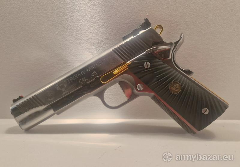 Opis: Do sprzedania bardzo ładny Springfield Trophy Match w kalibrze 45. Powiększony zatrzask zamka firmy Wilson Combat. Płaski spust również firmy Wilson Combat, okladziny Wilson Combat, zainstalowany system kontroli podrzutu DPM. Muszka oryginalna ale wyfrezowana i zainstalowany światłowód. Kurek, zatrzask zamka pokryte 24k złotem. W zestawie 1 magazynek Wilson Combat.