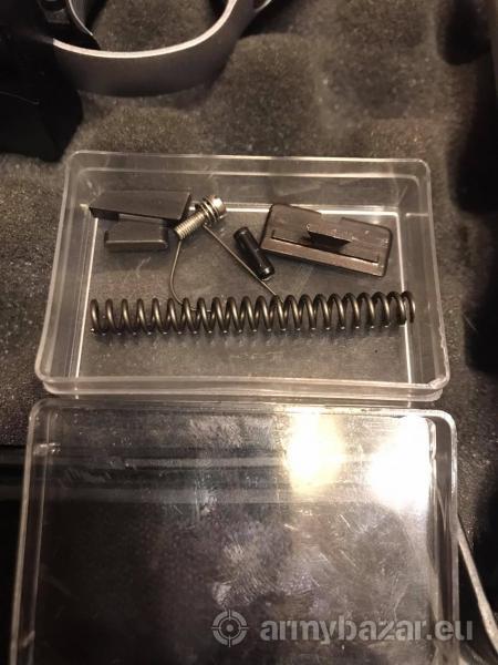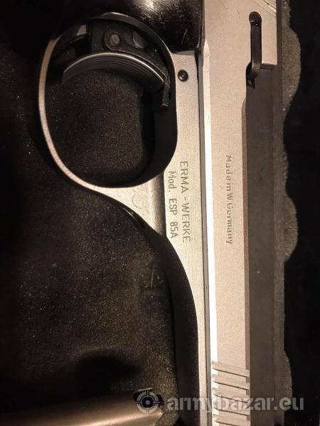 Opis: Tarczowy pistolet bocznego zapłonu Erma Werke Match ESP 85A, kal. 22 LR. Szczegółowy opis: https://szwadron.podlasie.pl/erma-esp-85a/ W komplecie 2 magazynki, zapasowa iglica, sprężyna spustu i napięcia iglicy, dodatkowa szeroka szczerbinka i muszka.