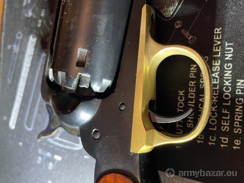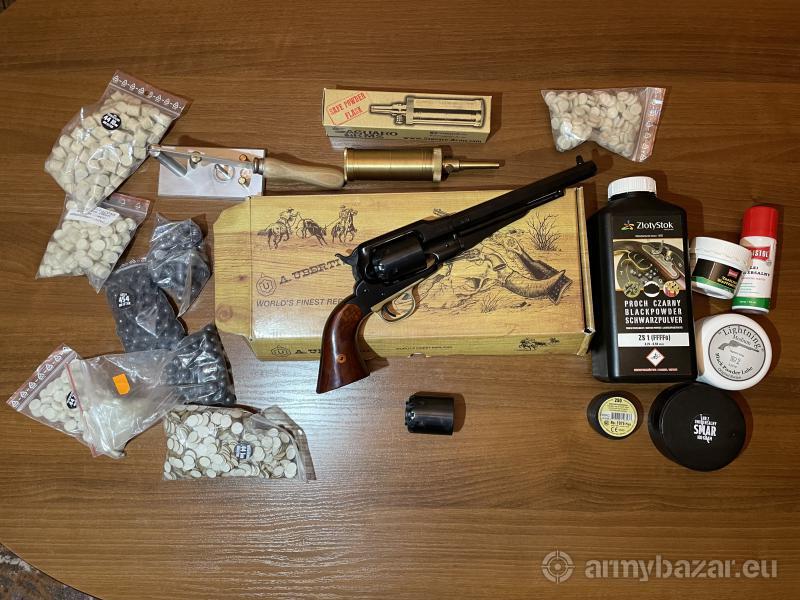 Opis: Witam. Na sprzedaż zestaw ze zdjęcia z wszystkim co potrzebne do strzelania CP. Rewolwer praktycznie nówka nastrzał niecałe 100 kul. Sprzedaje bo zrobiłem pozwolenie. - Remington New Army .44 (Uberti); - zapasowy bęben - kule .454; - pociski Conical .44 - kapiszony RWS; - przybitki różne - smary - praska do ładowania kul; - miarka do prochu, - prochownica Saguaro, - 1kg prochu ZS. Kontakt pod 725 975 859